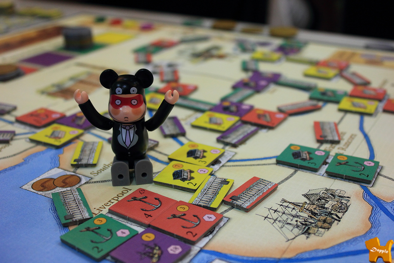Brass:馬丁大師的作品,大至上應該是利用自己的手牌在版圖上建造港口/礦坑/造鐵廠/棉花廠/運河/鐵路,再將它們賣掉或消耗掉上方資源來賺錢得分。第1次玩,聽規則的時候一直被冷爺亂入閒聊沒有很專心聽